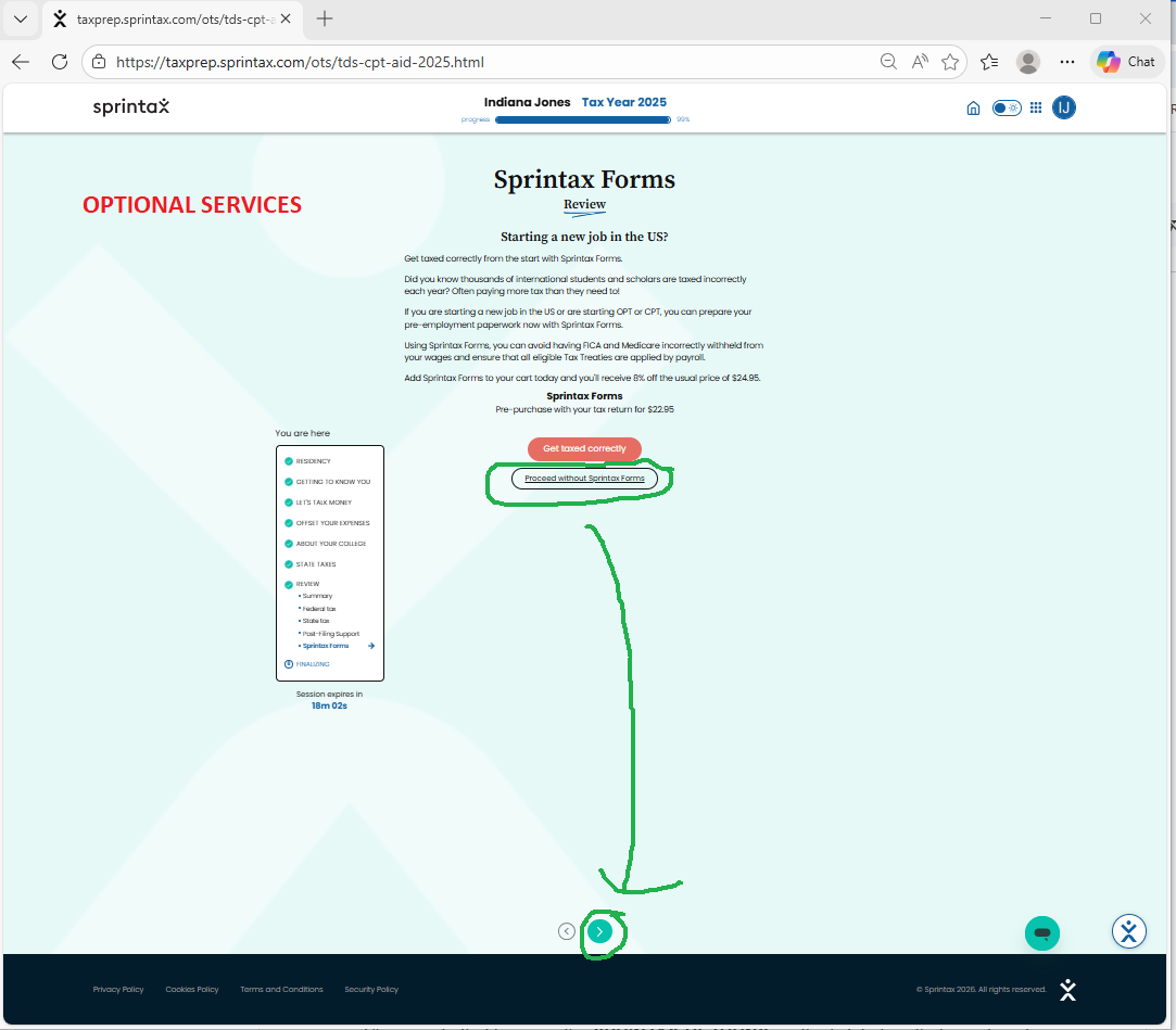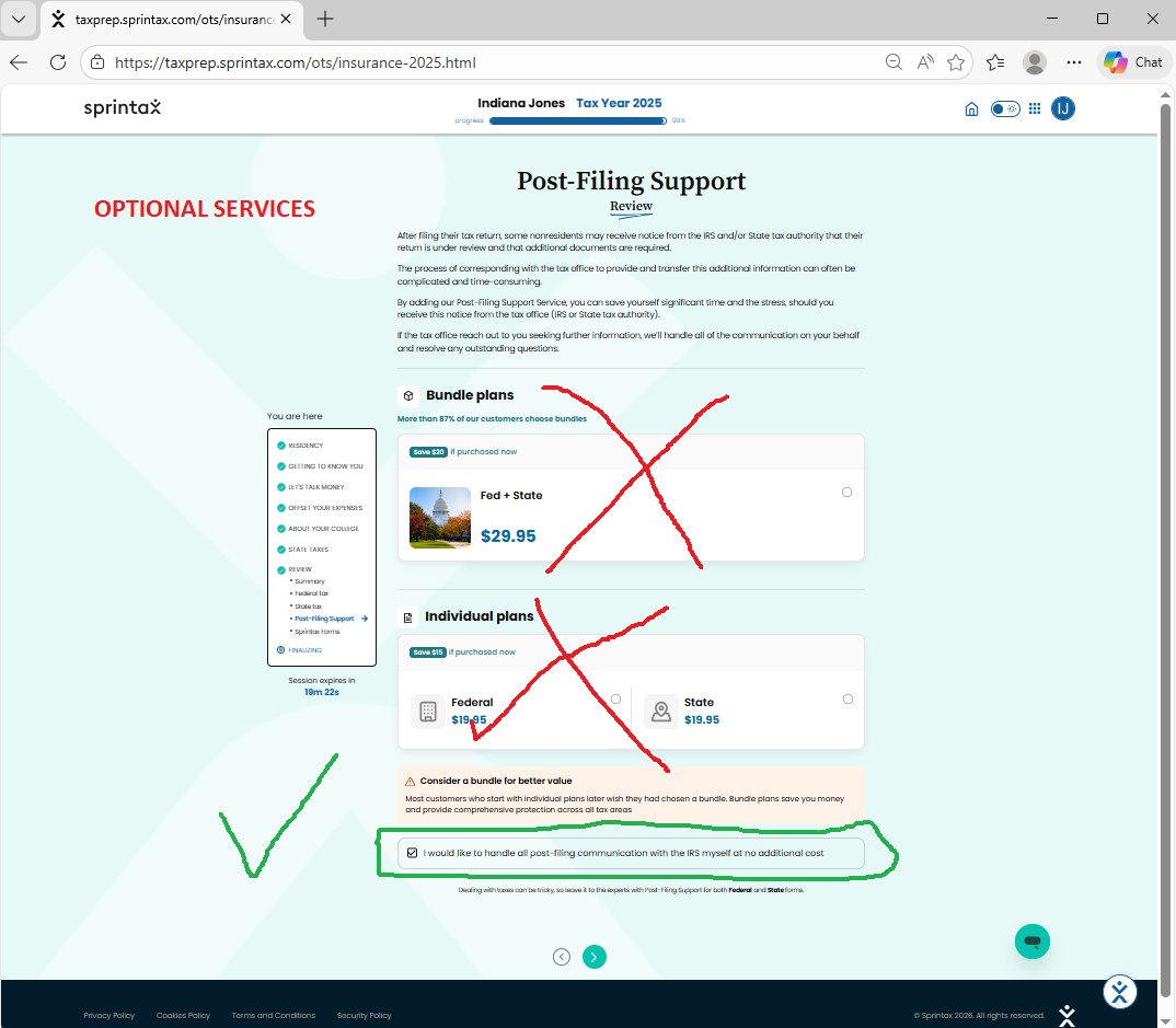 Please NOTE: There are additional optional services that are not required and can be waived (Post Filing Support), and (Sprintax Forms [CPT/OPT pre-employment]). If you select these optional services, you will be liable for any charges. Otherwise, the Brown Federal + 1 State discount (if eligible) will be applied on the (Review/Finalizing) step provided that you access Sprintax-Returns via the linked page below. View the 3 screenshots linked in this paragraph for reference.