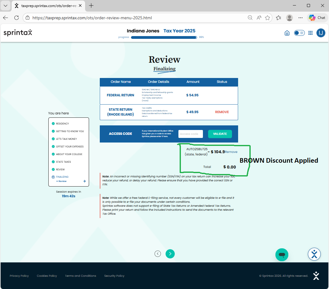 NOTE: Do NOT remove the State Return from the Review/Finalizing step as you need to complete both a Federal Return and State Income Tax Returns and the Brown Discount will waive the fees of both the Federal and 1 State Return, so prepare both the Federal and the State Return. Once all discounted access codes have been exhausted, users would need to pay the Sprintax-Returns fees so filing early is recommended.
